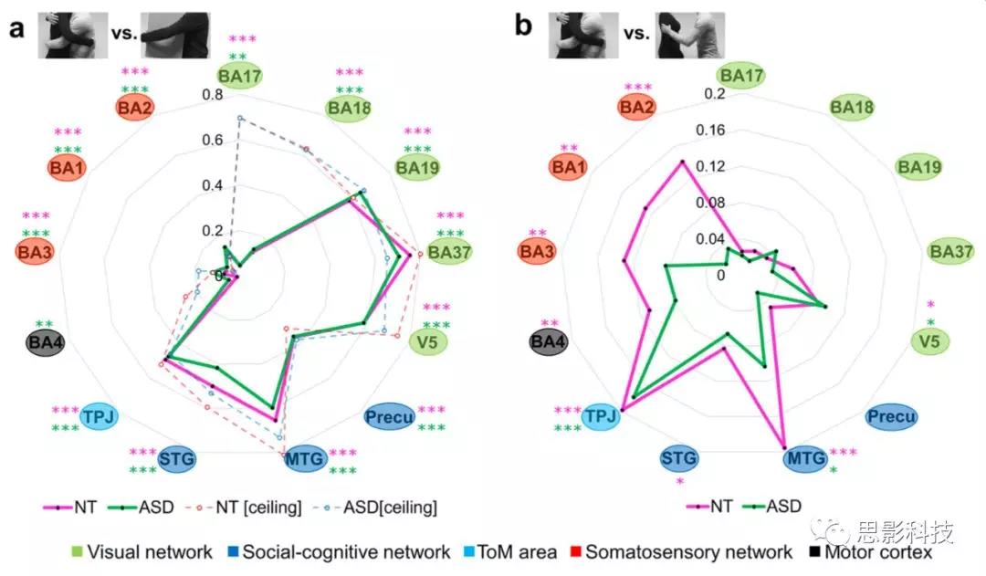 多元回歸分析證實,即使在控制了所有其他回歸變量(如低水平視覺特征和運動反應)的影響之后,幾乎每一個ROI都代表了社會和非社會觸摸場景之間的區(qū)別(13個p值中,兩組均有11個< 0.001)。重要的是,ToM核心區(qū)(TPJ (t(40) = 0.67, p = 0.50)和體感區(qū)(BA3 z = 0.93, p = 0.35;BA2 z = ? 0.31, p = 0.76)的神經選擇性沒有明顯的組間差異(如圖5a)。這說明,ASD組在社交和非社交方面的神經選擇性表現在他人的觸摸行為上。
