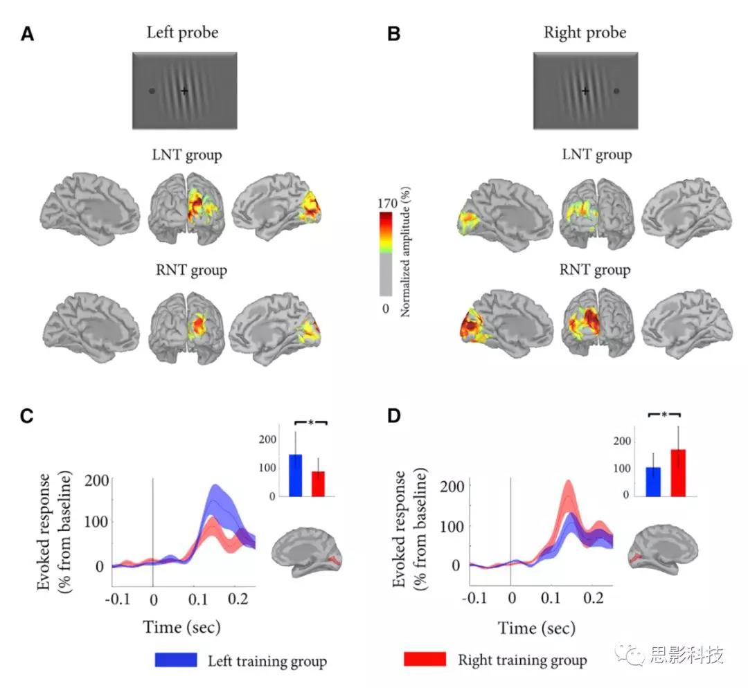 將預(yù)處理后的神經(jīng)反饋數(shù)據(jù)被以探測(cè)刺激開(kāi)始時(shí)的-200 ms~300 ms進(jìn)行分段。誘發(fā)反應(yīng)圖的計(jì)算是通過(guò)試次的平均值并映射到dSPM重建的皮質(zhì)圖上。將結(jié)果的地圖標(biāo)準(zhǔn)化為相對(duì)于平均基線的百分比變化。用20hz低通濾波器平滑。作者分別計(jì)算了左探測(cè)刺激和右探測(cè)刺激開(kāi)始后100ms~200ms的誘發(fā)反應(yīng)平均振幅。先前的研究表明,注意對(duì)早期視覺(jué)皮層的影響發(fā)生在這個(gè)時(shí)間范圍內(nèi)。這些值被認(rèn)為是空間注意分配的指標(biāo),并在兩個(gè)訓(xùn)練組之間進(jìn)行比較。