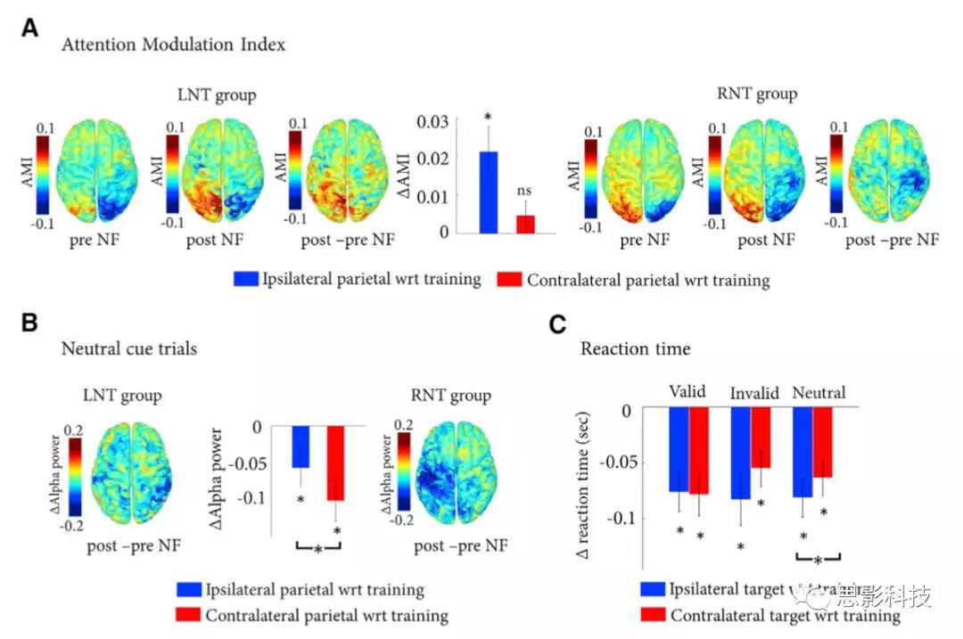 在訓(xùn)練后階段,神經(jīng)反饋訓(xùn)練可導(dǎo)致空間注意的持續(xù)調(diào)節(jié)。作者發(fā)現(xiàn)神經(jīng)和行為效應(yīng)與訓(xùn)練方向一致。