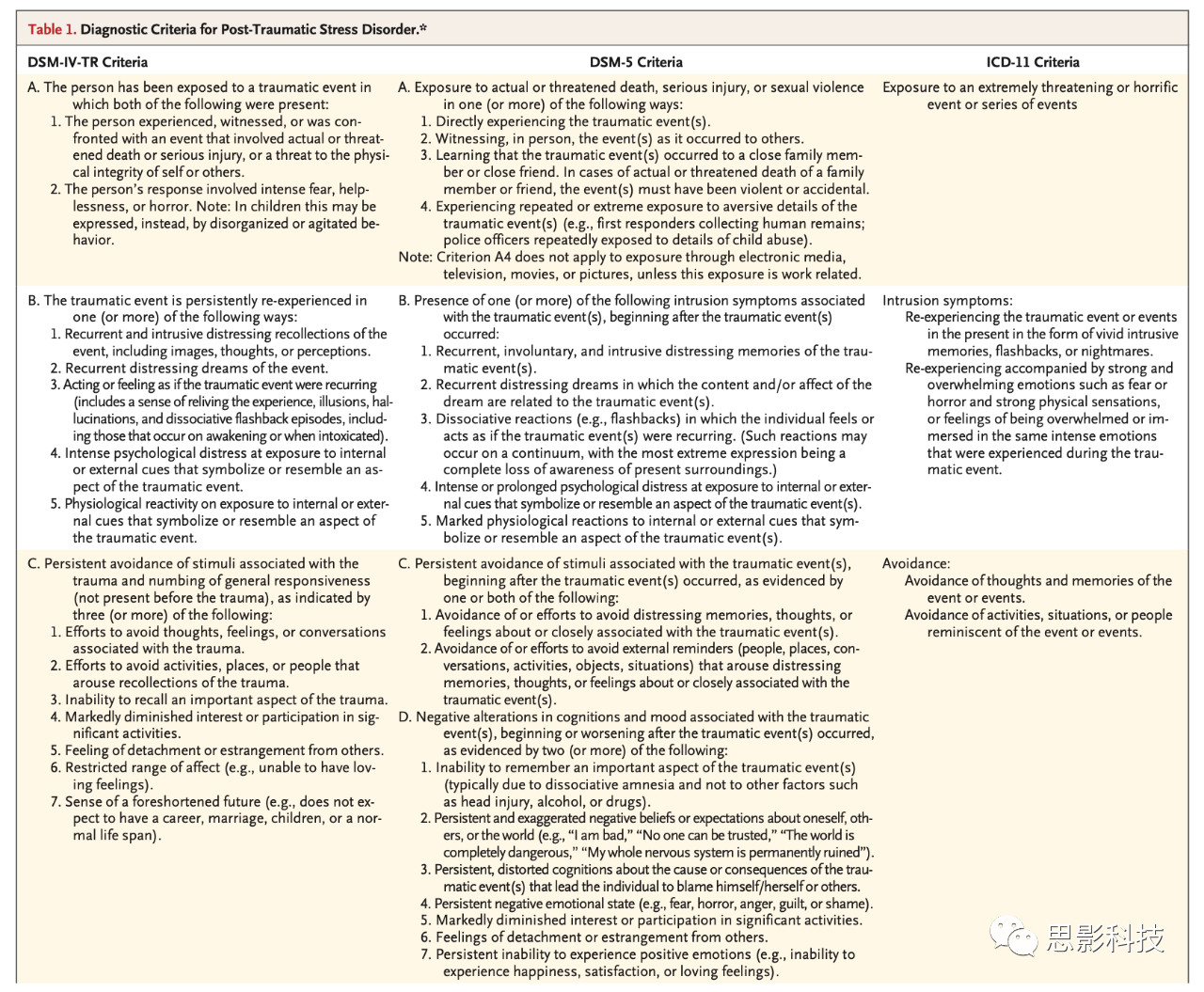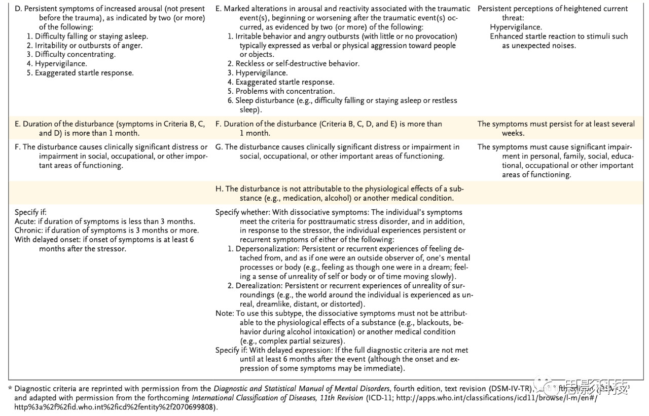 與第四版(DSM-IV-TR)相比,美國精神病學(xué)協(xié)會(huì)第五版(DSM-5)對PTSD的診斷標(biāo)準(zhǔn)進(jìn)行了大幅更新(表1)。創(chuàng)傷后應(yīng)激障礙現(xiàn)在屬于一個(gè)新的類別,稱為創(chuàng)傷和壓力相關(guān)障礙;回避或者說逃避性行為已經(jīng)被作為一個(gè)必要的診斷依據(jù)(原文為diagnostic clusters, 這里應(yīng)當(dāng)是說不是單個(gè)行為,而是一種叢聚出現(xiàn)的表現(xiàn)),在新的診斷標(biāo)準(zhǔn)中負(fù)面認(rèn)知被強(qiáng)調(diào),創(chuàng)傷事件不被定義為對創(chuàng)傷性事件的恐懼或無助的最初反應(yīng)。相比之下,世界衛(wèi)生組織(WHO)即將發(fā)布的第11版《國際疾病分類》(ICD-11)保留了6種ptsd特異性癥狀,消除了其他疾病共有的癥狀(表1)。 這些修改的結(jié)果具有重要的臨床意義。最近的臨床研究表明,根據(jù)DSM-IV標(biāo)準(zhǔn)確定的PTSD患者與符合DSM-5標(biāo)準(zhǔn)的患者之間僅有55%的重疊,而這三種標(biāo)準(zhǔn)之間(DSM-IV、DSM-5和ICD-11)之間僅有30%的重疊。此外,過去幾十年的研究使用了DSM-IV診斷標(biāo)準(zhǔn),而以前的發(fā)現(xiàn)在多大程度上仍然適用于DSM-5標(biāo)準(zhǔn)尚不清楚??傮w看來,新的診斷標(biāo)準(zhǔn)強(qiáng)調(diào)PTSD相關(guān)的消極認(rèn)知、自我貶低和消極世界觀,并鼓勵(lì)臨床醫(yī)生在評估和干預(yù)時(shí)考慮這些特征。診斷模板之間的差異應(yīng)該提醒臨床醫(yī)生注意診斷標(biāo)準(zhǔn)之間的根本差異,診斷標(biāo)準(zhǔn)是指疾病的指標(biāo),而患者的癥狀則更全面。在PTSD定義變化的更廣泛影響變得清晰之前,臨床醫(yī)生應(yīng)謹(jǐn)慎對待那些在從早期定義到后期定義的轉(zhuǎn)變中不再符合PTSD診斷標(biāo)準(zhǔn)的人,不要輕易地使用這些轉(zhuǎn)變標(biāo)準(zhǔn)從而拒絕使他們獲得相應(yīng)的治療或保險(xiǎn)或殘疾福利。