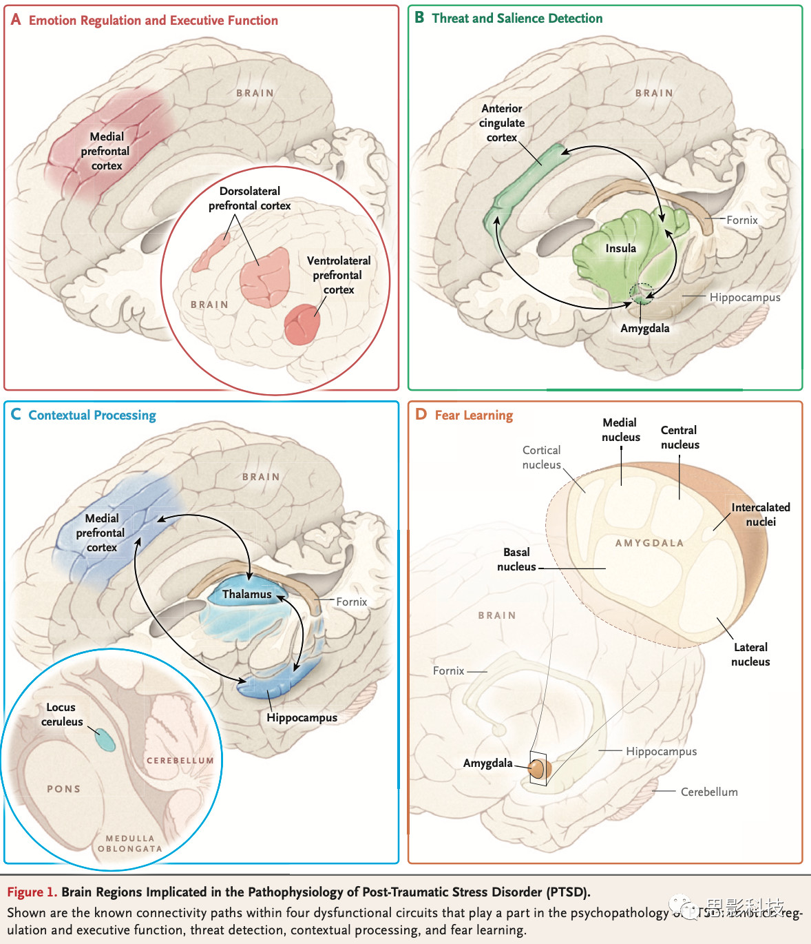 圖1 PTSD的神經(jīng)生物學(xué)模型注:圖中顯示的是在PTSD的精神病理學(xué)中起作用的四個(gè)功能失調(diào)回路中的已知連接路徑:情緒調(diào)節(jié)和執(zhí)行功能、威脅檢測、情境處理和恐懼習(xí)得。對這四個(gè)不同模型的簡略論述在下文中展開。