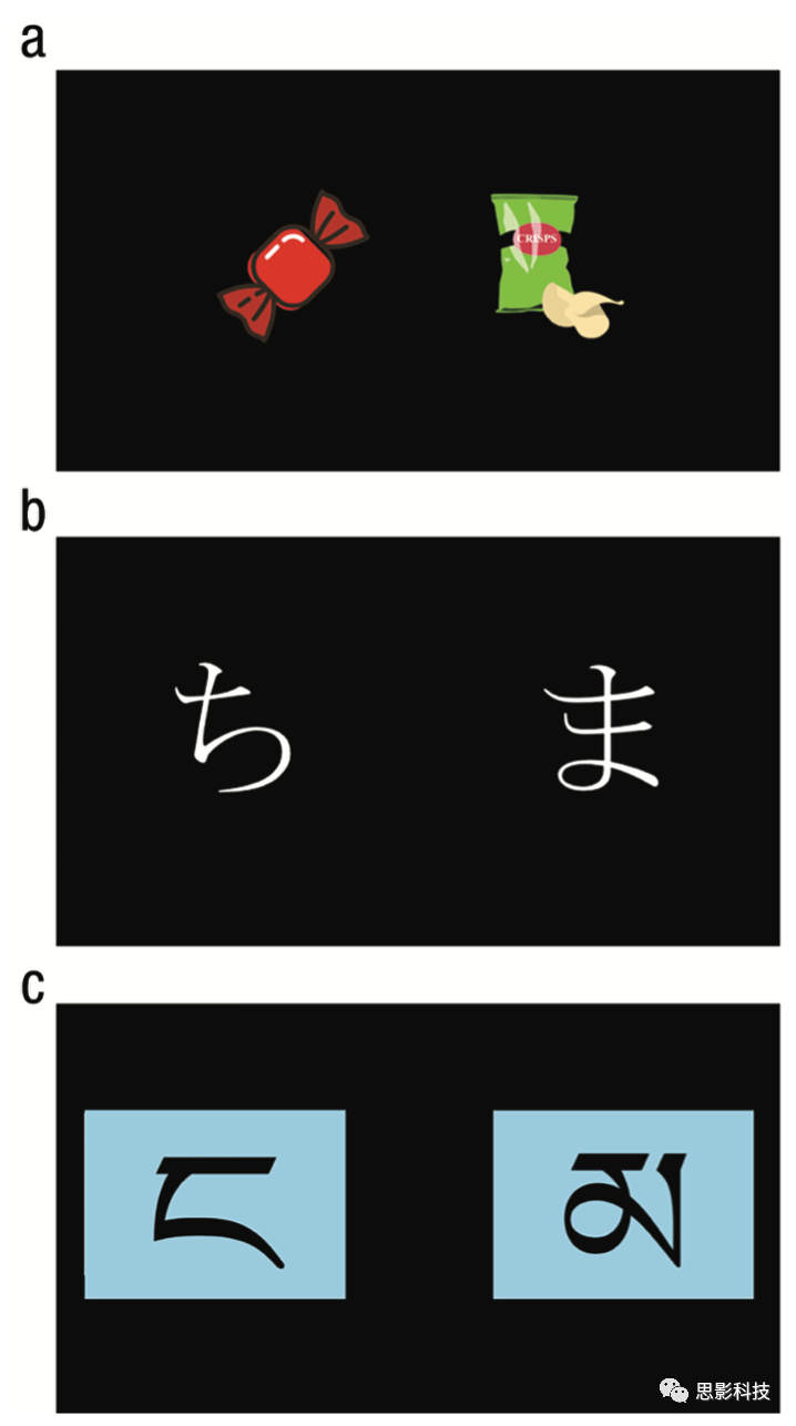 研究方法:本研究檢驗(yàn)了來(lái)自6項(xiàng)眼動(dòng)研究的數(shù)據(jù),以描述注視和選項(xiàng)價(jià)值在選擇過(guò)程中的交互作用。其中2、3、4、6項(xiàng)研究采用EyeLink 1000 Plus眼動(dòng)儀采集眼動(dòng)數(shù)據(jù)。6項(xiàng)眼動(dòng)研究數(shù)據(jù)均為二選一的數(shù)據(jù)集,其中數(shù)據(jù)集1-4是從兩種食物中進(jìn)行選擇(食物選擇任務(wù)),數(shù)據(jù)集5和6是從習(xí)得的符號(hào)刺激之間進(jìn)行選擇(概率任務(wù))。在食物選擇任務(wù)中(如圖1a),每個(gè)試次的選項(xiàng)不同,也沒(méi)有客觀正確的選項(xiàng)。在概率任務(wù)中,選項(xiàng)會(huì)重復(fù),有客觀正確的選項(xiàng),該選項(xiàng)獲獎(jiǎng)概率更高。在數(shù)據(jù)集5中(如圖1b),共有6種不同的選項(xiàng),對(duì)應(yīng)30次選擇。在數(shù)據(jù)集6中(如圖1c),只有兩對(duì)符號(hào),每次選擇時(shí)被試會(huì)看到其中一對(duì)符號(hào)。盡管這些符號(hào)在整個(gè)實(shí)驗(yàn)過(guò)程中保持不變,但每個(gè)符號(hào)產(chǎn)生獎(jiǎng)勵(lì)的概率隨機(jī)變化。