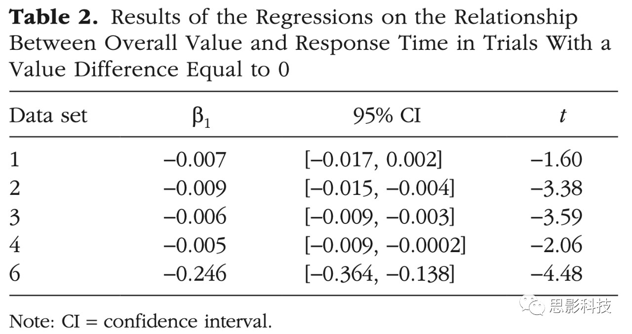 log(RT)~β0+β1|UL?UR| + β2 (UL+UR).正如預(yù)期,乘法模型模擬了在RT和總值之間的負(fù)相關(guān)關(guān)系(圖3a),而加法模型沒(méi)有(圖3b)。作者在6個(gè)數(shù)據(jù)集中都使用真實(shí)數(shù)據(jù)進(jìn)行了擬合,在乘法模型模擬中,在每種情況下β2系數(shù)都顯著為負(fù),表明總值(UL+UR)的增加對(duì)應(yīng)于RT的減少(圖3c)。為了更直接地測(cè)試總價(jià)值和RT之間的關(guān)系,本研究進(jìn)行了類似的混合效應(yīng)回歸,但只使用了值差等于零的試驗(yàn)。這使得模型可以放棄選項(xiàng)值差異變量,將模型簡(jiǎn)化為:log(RT)~β0+ β1 (UL+UR).結(jié)果發(fā)現(xiàn)在五分之四的數(shù)據(jù)集中,β1系數(shù)顯著(見(jiàn)Table 2),證實(shí)了總價(jià)值和RT之間的負(fù)相關(guān),為乘法模型提供了額外支持。