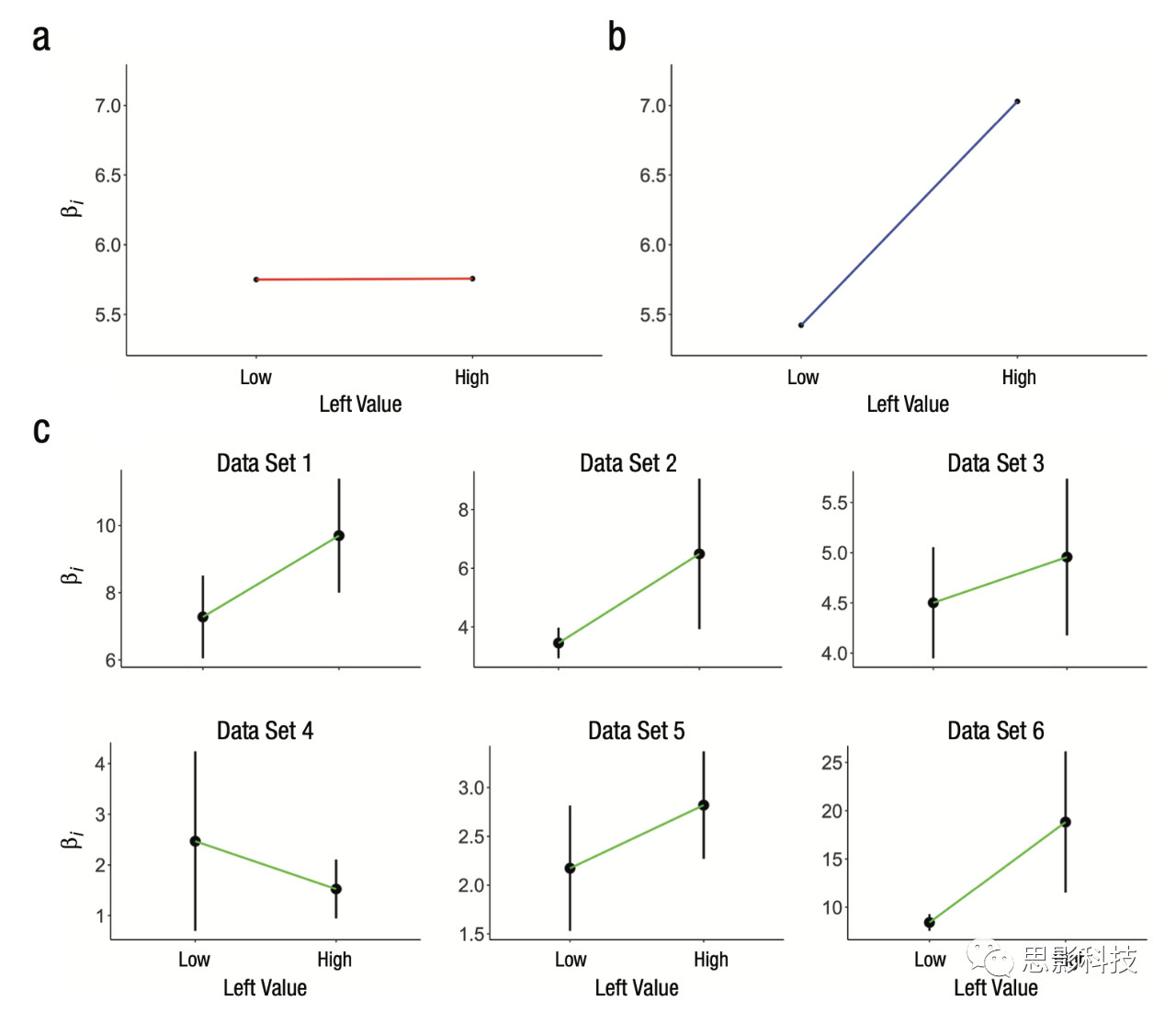 另一種測(cè)試注意力對(duì)選擇影響機(jī)制的方法是建立價(jià)值和注視之間的交互模型。根據(jù)乘法模型,相對(duì)于關(guān)注價(jià)值較低的選項(xiàng),關(guān)注價(jià)值較大的選項(xiàng)對(duì)選擇的影響更大。而加法模型假定被關(guān)注選項(xiàng)的價(jià)值不影響注意力對(duì)選擇的影響。為了驗(yàn)證這一預(yù)測(cè),作者使用與之前相同的模擬和回歸選擇結(jié)果(選擇左)對(duì)選項(xiàng)間的值差(UL? UR)、總值(UL + UR)和左停留比例(左側(cè)選項(xiàng)的注視停留時(shí)間/總注視停留時(shí)間)進(jìn)行分析,分為兩種情況:一種是左側(cè)值小于組數(shù)據(jù)集的中值,另一種是左側(cè)值大于或等于組數(shù)據(jù)集的中值。換言之,在每次試驗(yàn)中,只有一個(gè)左停留比例變量具有非零值。更明確地說(shuō),其實(shí)是估計(jì)了以下的邏輯模型:choose left ~ β0 + β1(UL? UR) + β2 (UL + UR) + β3(left dwell proportion) |(left value < median (left value )) + β4 (left dwell proportion)|(left value ≥ median (left value)).然后,作者繪制了β3和β4的值(見(jiàn)圖4a和4b)。如預(yù)期,乘法模型中低價(jià)值(β3 = 5.423)的左停留比例系數(shù)要小于高價(jià)值(β4= 7.029)。而加法模型對(duì)低價(jià)值(β3 = 5.750)和高價(jià)值(β4 = 5.757)具有相同的系數(shù)。這說(shuō)明,乘法模型中對(duì)于左選擇結(jié)果和價(jià)值比例之間的關(guān)系預(yù)測(cè)更加敏感。作者觀察到,在6個(gè)數(shù)據(jù)集中的5個(gè)數(shù)據(jù)集中,高價(jià)值和低價(jià)值之間存在正性差異(見(jiàn)圖4c)。各數(shù)據(jù)集的單尾配對(duì)樣本t檢驗(yàn)結(jié)果多為邊緣或非顯著。數(shù)據(jù)集1:t(37) = 1.99, p = .027;數(shù)據(jù)集2:t(43) =1.20, p = .119;數(shù)據(jù)集3:t(43) = 0.74, p = .233;數(shù)據(jù)集4:t(32) =?0.57,p = .713;數(shù)據(jù)集5:t(19) = 1.00,p = .166;數(shù)據(jù)集6:t(42) = 1.44, p = .079。然而,結(jié)合起來(lái),發(fā)現(xiàn)在預(yù)期方向上有顯著差異,t(221) = 2.25, p = .013。用中位數(shù)分割來(lái)估計(jì)注意力的影響,可以避免假設(shè)價(jià)值對(duì)停留比例和選擇之間的關(guān)系有線性影響。作者也在每個(gè)數(shù)據(jù)集的單獨(dú)級(jí)別運(yùn)行了一個(gè)更簡(jiǎn)單的線性交互模型。分析結(jié)果支持在食物選擇研究中的乘法效應(yīng),但不支持概率任務(wù)中的乘法效應(yīng)。