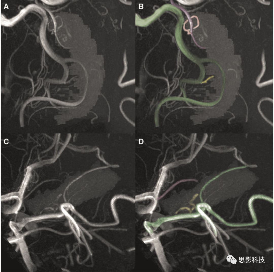 圖1:A與B圖為海馬混合血管供應(yīng)模式。圖中綠色的血管代表大腦后動脈,黃色血管為其供應(yīng)海馬的分支,紫色血管為脈絡(luò)膜前動脈,粉色血管為其發(fā)出的分支,可以明顯看到大腦后動脈與脈絡(luò)膜前動脈均為海馬供血。而C與D圖為海馬單血管供應(yīng)模式,僅有大腦后動脈分支進(jìn)行供血,未見脈絡(luò)膜前動脈發(fā)出分支供血。