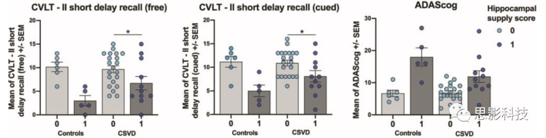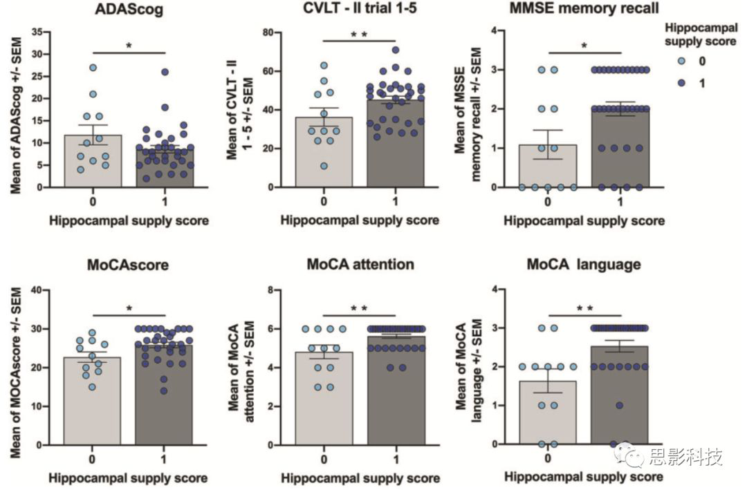 圖2:海馬血管供應(yīng)模式對認(rèn)知的影響??梢悦黠@看出海馬混合血管供應(yīng)模式的被試各項認(rèn)知檢測均優(yōu)于海馬單血管供應(yīng)模式被試(ADAScog越高代表認(rèn)知越差)。*代表P<0.05,**代表P<0.01(Bonferroni校正)。