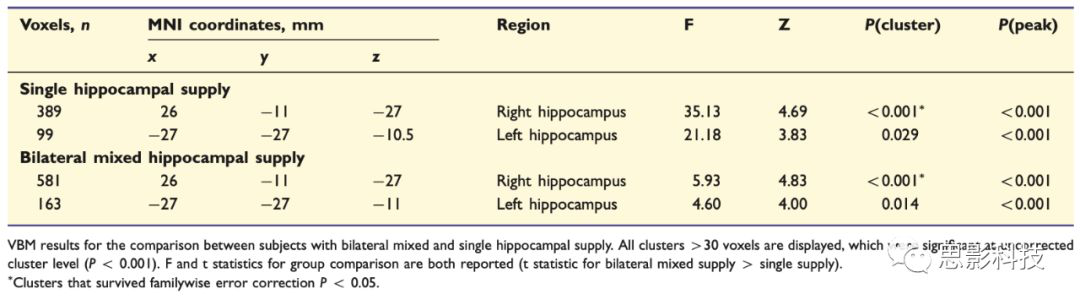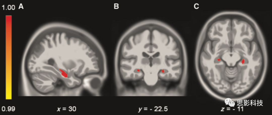 圖5:海馬血管供應(yīng)模式相關(guān)的VBM分析??梢姾qR混合血管供應(yīng)模式的被試具有較高灰質(zhì)密度,主要位于海馬前部(P<0.001,未校正)。