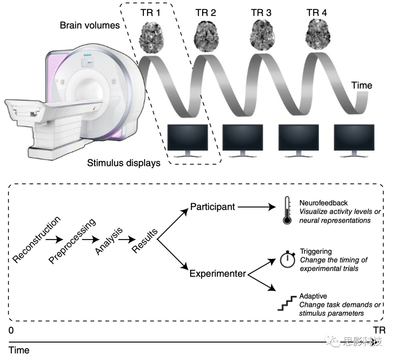 在神經(jīng)反饋研究中,被試使用實(shí)時(shí)結(jié)果來更改其策略或行為。實(shí)時(shí)功能磁共振成像的其他主要類別更加注重實(shí)驗(yàn)者對(duì)結(jié)果的處理方式。在“觸發(fā)”設(shè)計(jì)中,實(shí)驗(yàn)控制裝置監(jiān)視大腦區(qū)域的活動(dòng)水平,并在活動(dòng)量較低或較高時(shí)啟動(dòng)試驗(yàn),并預(yù)測(cè)這兩種情況下產(chǎn)生的不同行為。這可能會(huì)增強(qiáng)fMRI的因果關(guān)系,因?yàn)榇竽X活動(dòng)是一個(gè)獨(dú)立變量,因此有可能(通過適當(dāng)?shù)目刂茀^(qū)域)了解給定區(qū)域是否足以滿足行為要求。在“自適應(yīng)”設(shè)計(jì)中,實(shí)驗(yàn)者不是確定是否進(jìn)行試驗(yàn)(無論大腦如何活動(dòng)都定期進(jìn)行試驗(yàn)),而是確定下一次試驗(yàn)的內(nèi)容(例如刺激或任務(wù))。這樣做的目的是通過調(diào)整刺激參數(shù)直到區(qū)域的響應(yīng)達(dá)到最大來表征視覺系統(tǒng)的調(diào)整特性,但也可以用于檢查各種系統(tǒng)(例如,涉及注意力或記憶力的系統(tǒng))。