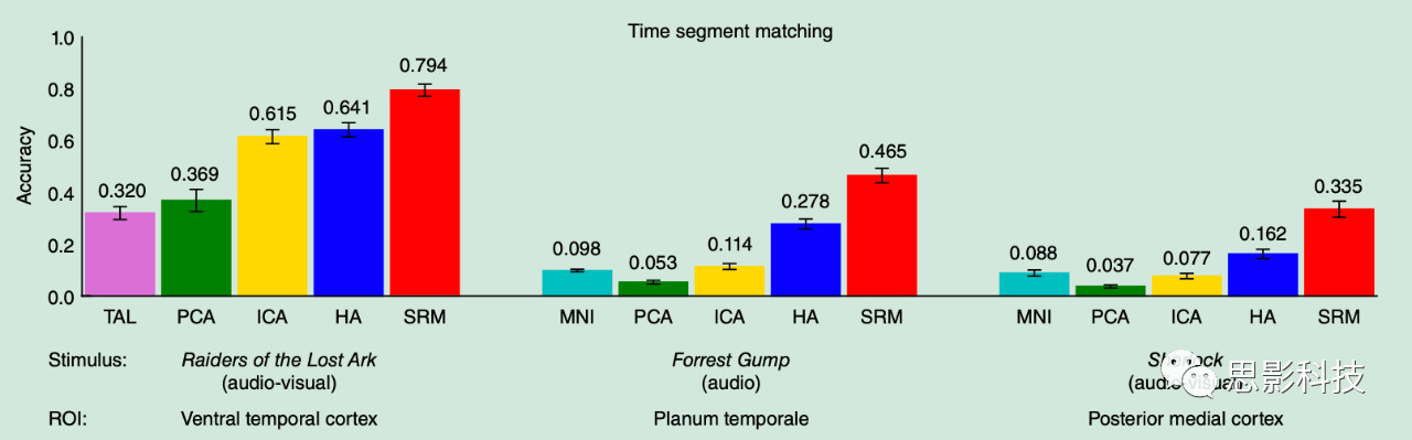 當(dāng)被試觀看和/或聆聽相同刺激時(shí),收集三個(gè)fMRI數(shù)據(jù)集。然后將收集到的數(shù)據(jù)在TAL空間或者MNI空間上對(duì)齊,從而為所有被試的數(shù)據(jù)提供一個(gè)通用的坐標(biāo)系。在這些例子中,僅對(duì)特定ROI中的體素的BOLD活動(dòng)信號(hào)進(jìn)行分析。通過嘗試根據(jù)其他被試的測(cè)試數(shù)據(jù)來確定單獨(dú)拿出來的被試的測(cè)試數(shù)據(jù)中的短片片段,從而評(píng)估刺激過程中共有的認(rèn)知狀態(tài)的強(qiáng)度。這是在使用跨被試因子模型之前或之后完成的:主成分分析(PCA),獨(dú)立成分分析(ICA),超對(duì)準(zhǔn)(HA)或SRM。對(duì)于降維方法(PCA,ICA,SRM),使用了k = 50個(gè)特征。假設(shè)短片片段是獨(dú)立的,則機(jī)會(huì)精度為0.001。