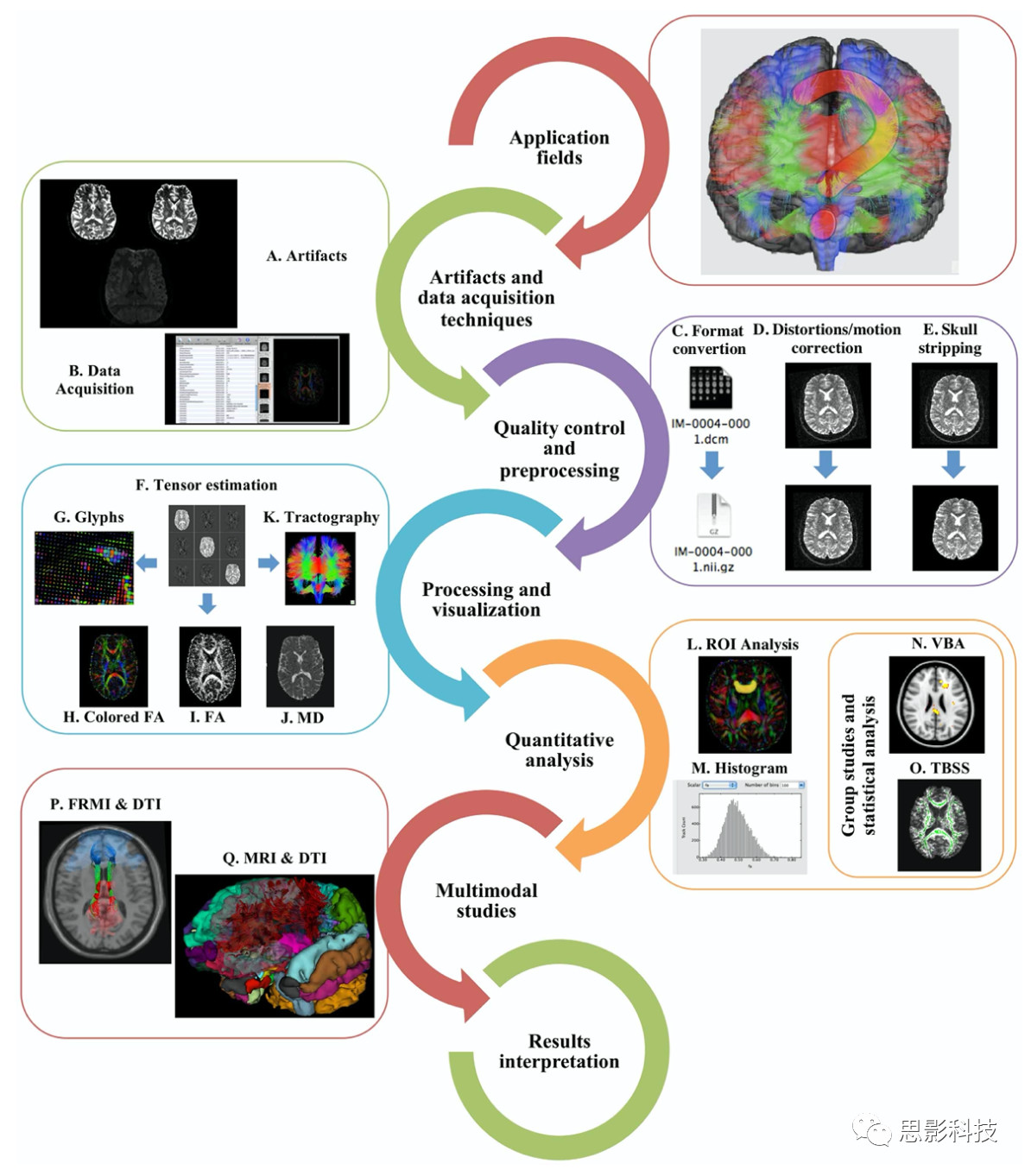 這些方面包括:采集協(xié)議、偽影處理、數(shù)據(jù)質(zhì)量控制、張量重建算法、可視化方法和定量分析方法。此外,研究人員和/或臨床醫(yī)生還需要考慮并決定DTI分析流程每個(gè)階段最適合的軟件工具。
