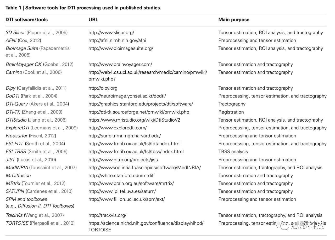 如今,各種各樣的免費(fèi)或商業(yè)的DTI軟件工具,有著不同的用途和規(guī)格。對于新手來說,從其他人中選擇一個(gè)可能是一項(xiàng)困難而耗時(shí)的任務(wù)。在Table 1中,作者列出了最常用的軟件工具及其主要適用性。主要用于臨床,商業(yè)應(yīng)用雖然直觀、友好、自動化,但也比較僵化和有限。
