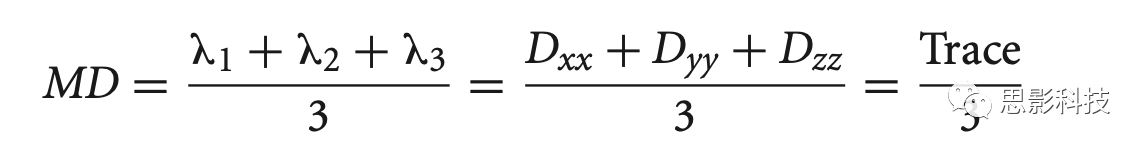 MD、ADC或trace可由這三個(gè)特征值的平均值計(jì)算,并對應(yīng)于分子擴(kuò)散率(較低的值表示較低的擴(kuò)散率)。下面是MD的計(jì)算公式(小學(xué)數(shù)學(xué),不用緊張),其中Dxx,Dyy,Dzzare擴(kuò)散張量的對角線項(xiàng):