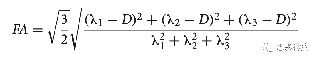 分?jǐn)?shù)各向異性(FA)是由各向異性擴(kuò)散引起的張量的分?jǐn)?shù)的標(biāo)準(zhǔn)化度量,對應(yīng)于各向異性擴(kuò)散或方向性的程度,范圍從0(各向同性擴(kuò)散)到1(各向異性擴(kuò)散),公式如下:
