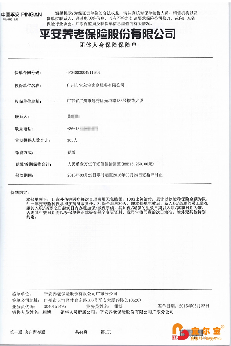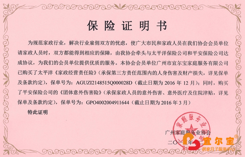 宜爾寶月嫂家政經(jīng)營(yíng)責(zé)任保險(xiǎn)保單